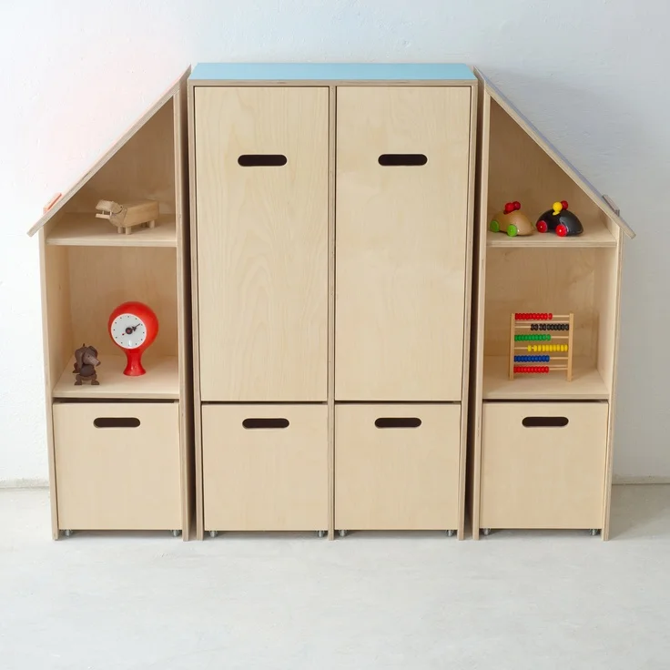 Kinkeli-system shelf er et hyllesystem som kan bygges ut i bredden, og som består av to moduler. En dobbelthylle og enkle hyller som sidestykker med skråtak.Med Kinkeli-systemshelf kan man bygge hyller med husform og lage små spisshus, eller lengre hus.Den er også fin uten endestykker med skråtak, og alle toppplater har slitesterk laminat i gode farger.Den består ellers av to hyller bak skapdørene, og praktiske kasser på hjul i nederste del.